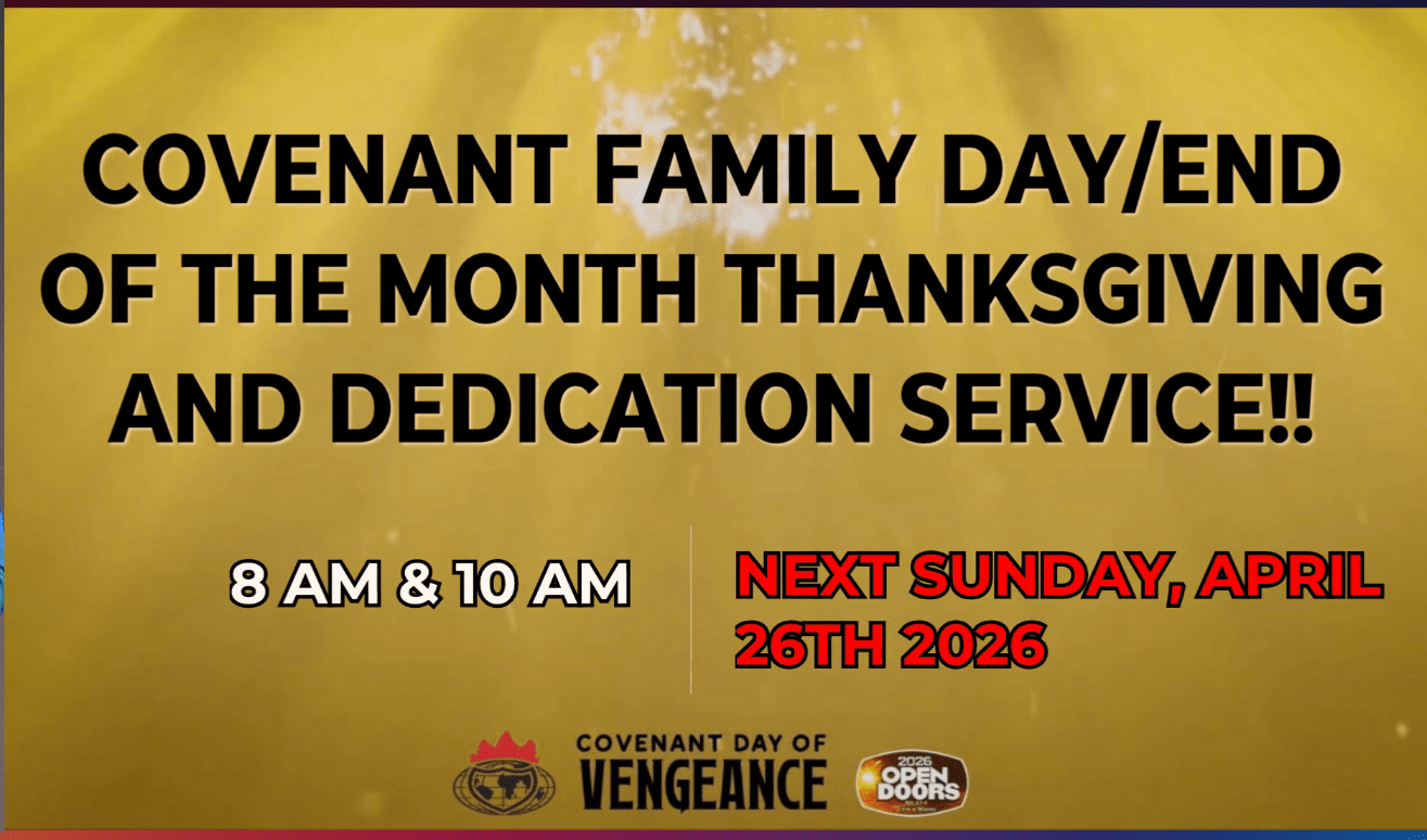GOOD NEWS! Next Sunday April 26th 2026 shall be our Covenant Family Day and End of the Month Thanksgiving and Dedication service. Our WOFBI students